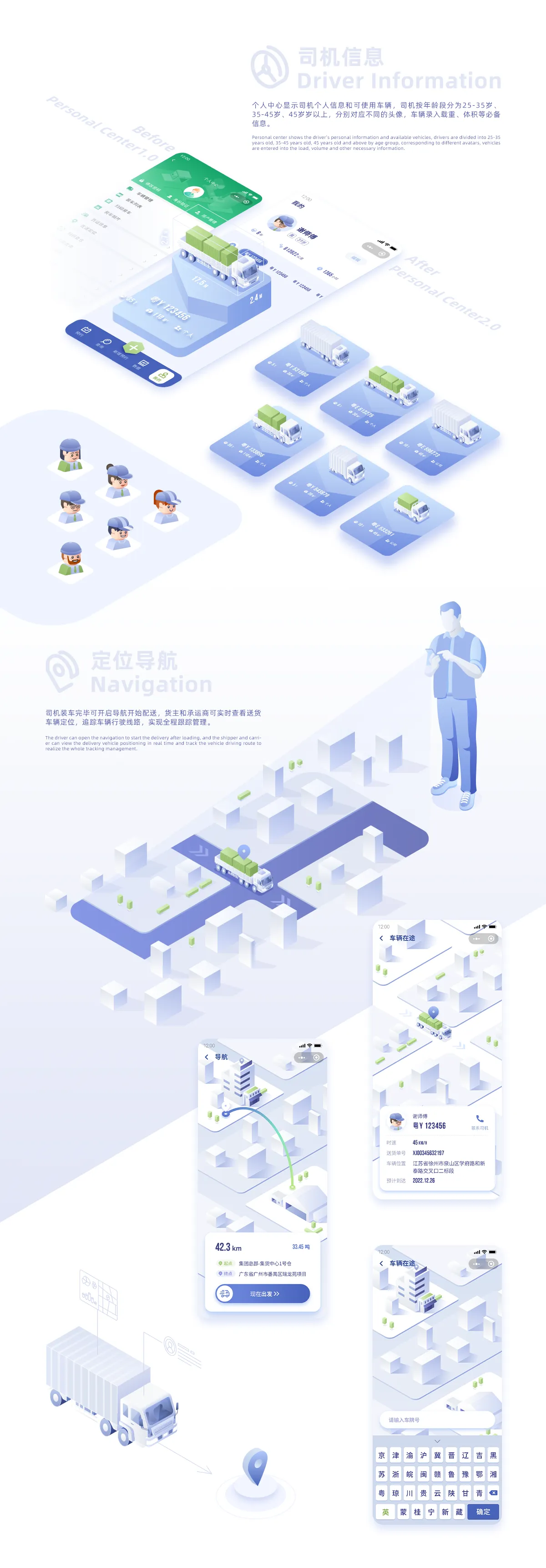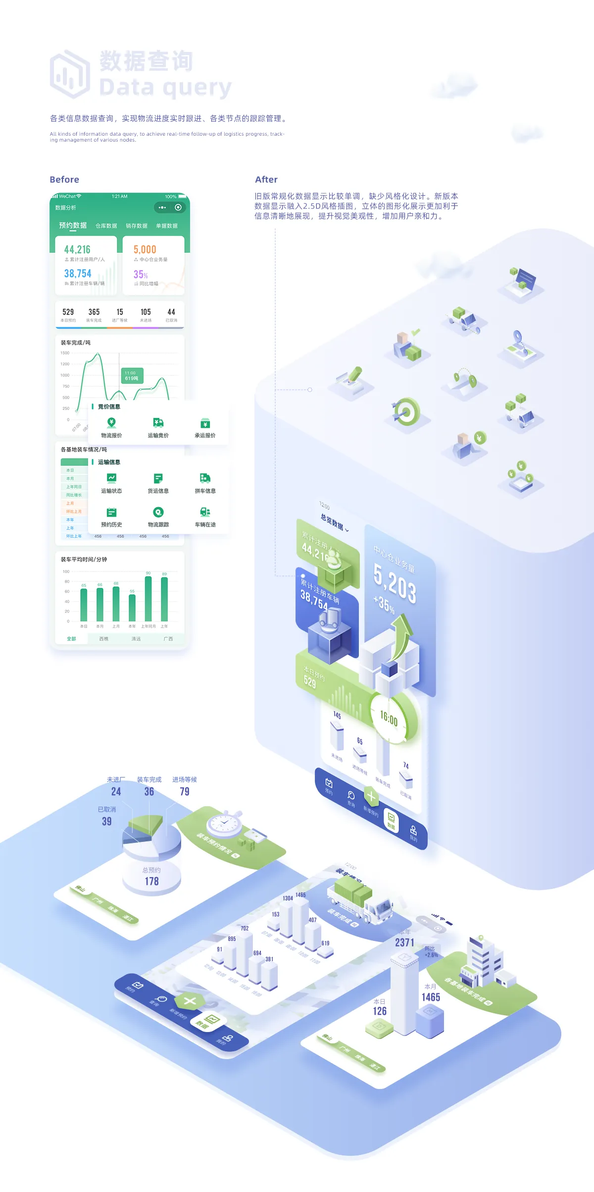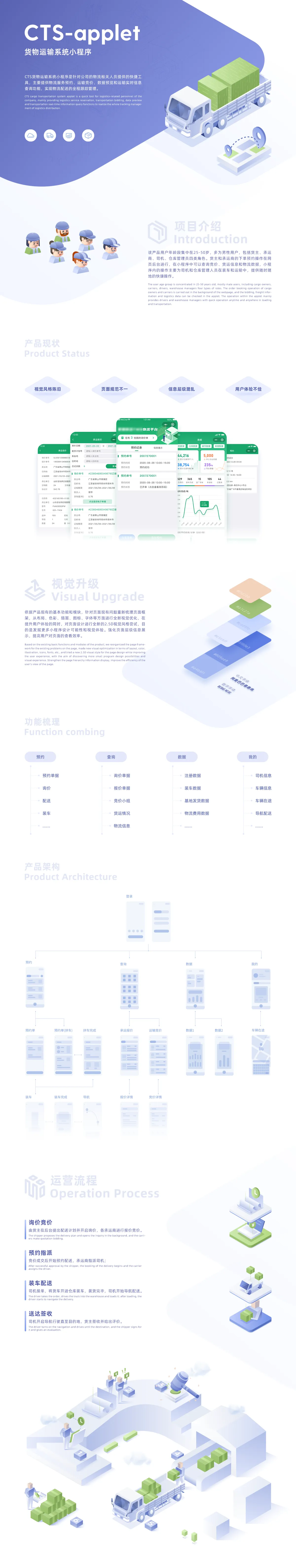 CTS貨物運輸小程序是一款針對物流公司量身打造的快捷管理工具,主要功能是物流服務(wù)預(yù)約、運輸競價、數(shù)據(jù)預(yù)覽、運輸實時信息查詢、實現(xiàn)物流配送的全程跟蹤等管理功能。本次設(shè)計基于現(xiàn)有的功能模塊,從布局、色彩、插畫、圖標(biāo)和字體等方面進行全方位的視覺升級,尤其是可視化的升級需求進行了大量的改進優(yōu)化。本次優(yōu)化升級在提升用戶體驗的同時,對頁面設(shè)計進行全新的2.5D視覺風(fēng)格嘗試,目的是發(fā)掘更多小程序設(shè)計可能性和視覺體驗。