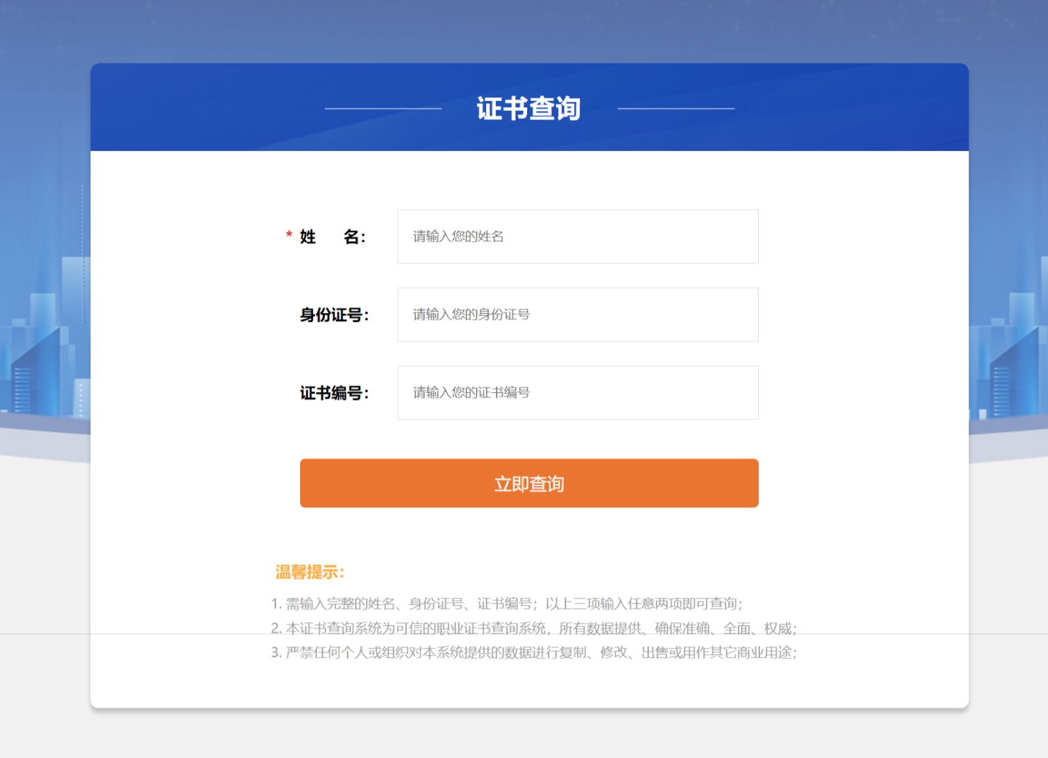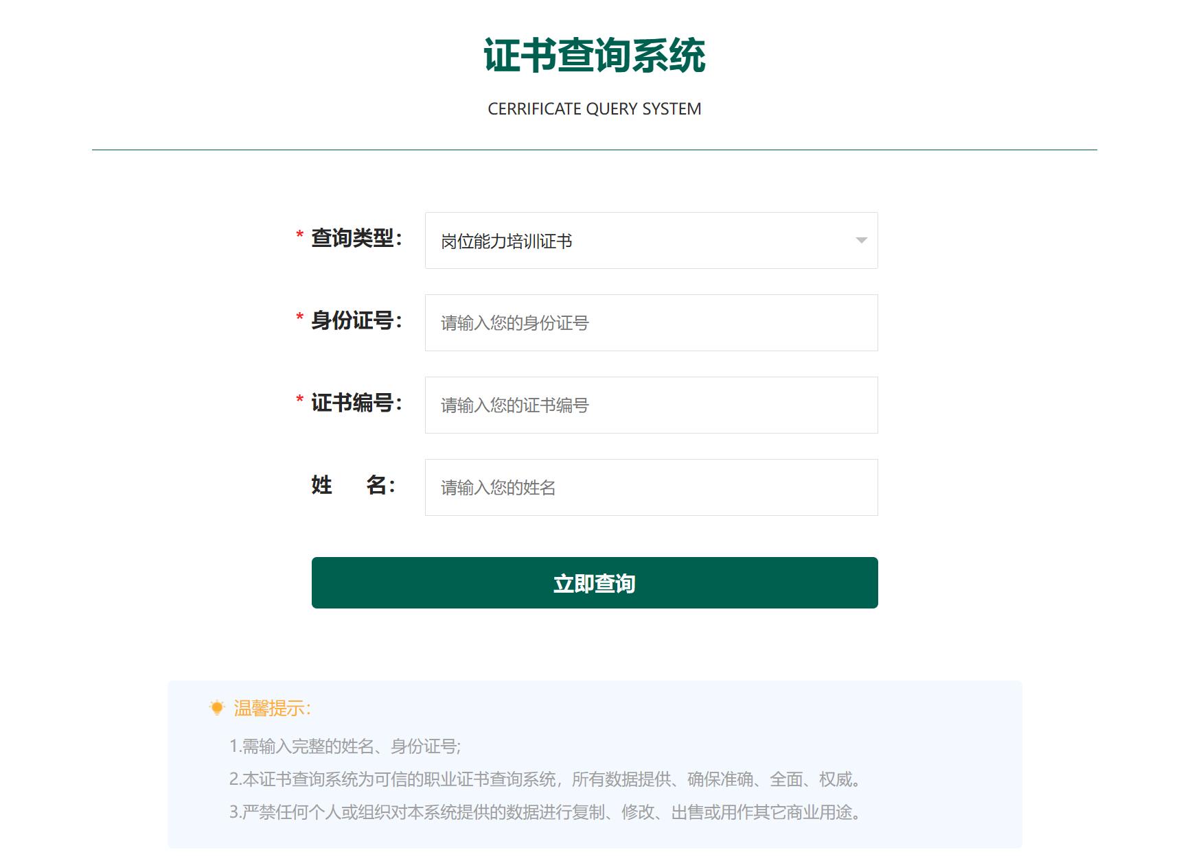 只需輸入簡單的信息,如證書編號、個人姓名或身份證號等關(guān)鍵要素,系統(tǒng)便可以迅速檢索出相應(yīng)的證書信息。查詢操作簡單易懂,無需復(fù)雜的操作流程,即使是計算機操作水平不高的用戶也能輕松上手,節(jié)省了用戶的時間和精力。