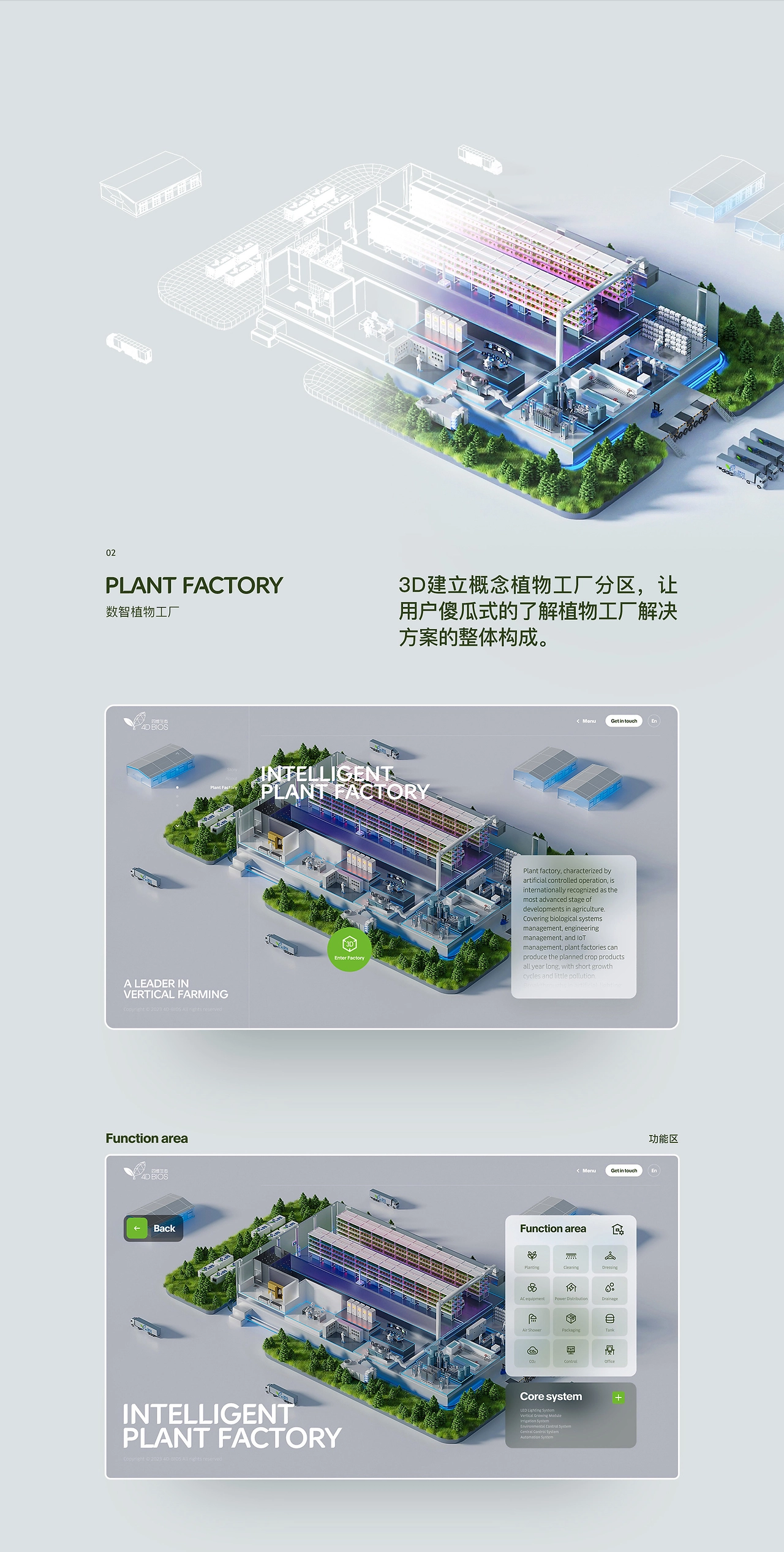 ④ 3D建立概念植物工廠分區(qū),讓用戶傻瓜式了解植物工廠解決方案的整體構(gòu)成。