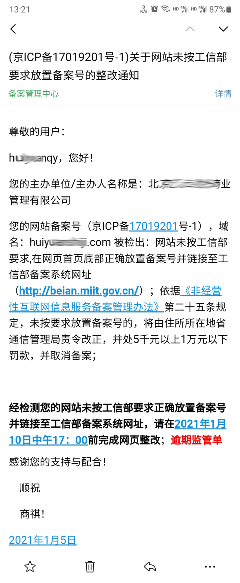您的網(wǎng)站備案號(京ICP備1206號-1),域名:xxx.com 被檢出:網(wǎng)站未按工信部要求,在網(wǎng)頁首頁底部正確放置備案號并鏈接至工信部備案系統(tǒng)網(wǎng)址(http://beian.miit.gov.cn/);依據(jù)《非經(jīng)營性互聯(lián)網(wǎng)信息服務(wù)備案管理辦法》第二十五條規(guī)定,未按要求放置備案號的,將由住所所在地省通信管理局責(zé)令改正,并處5千元以上1萬元以下罰款,并取消備案;