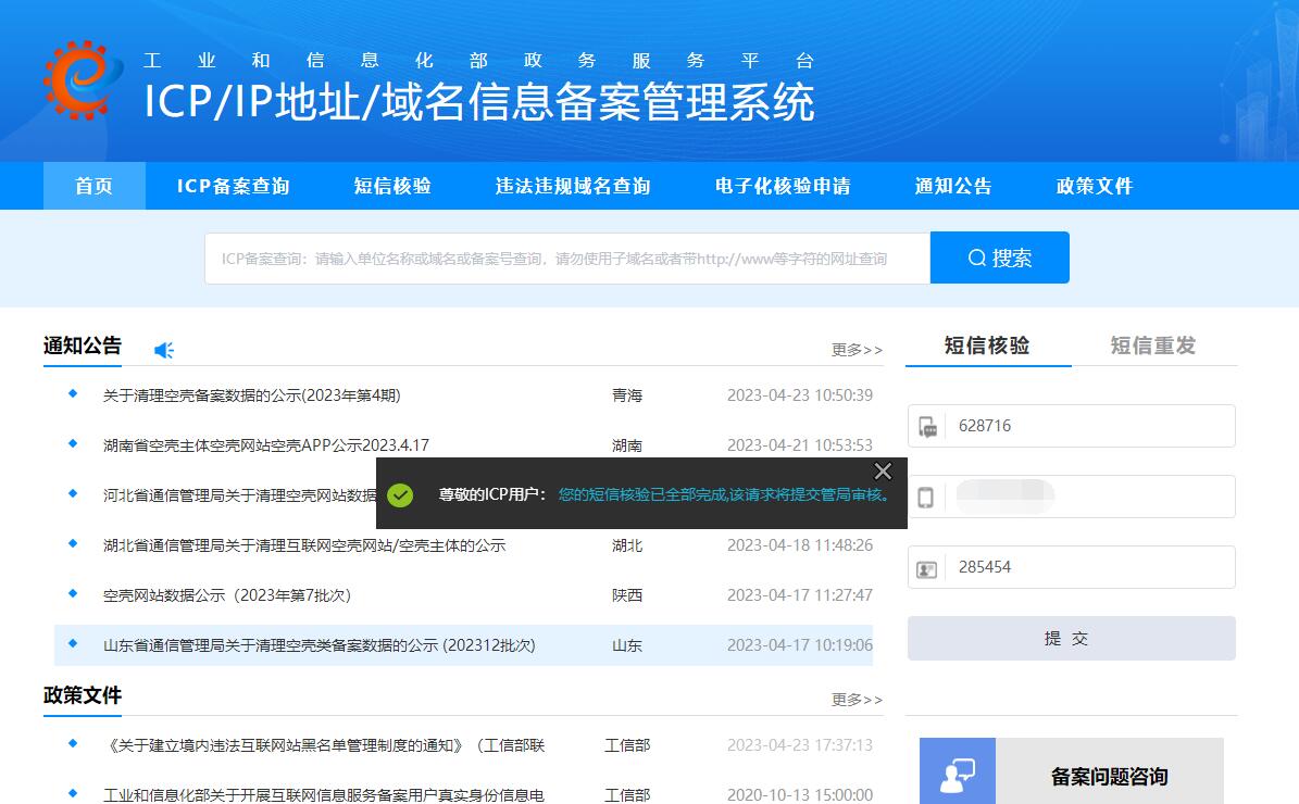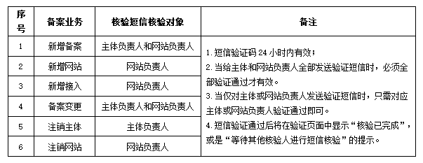 1:用戶提交的備案類型是首次新增備案時(shí),主體負(fù)責(zé)人(法人)及網(wǎng)站負(fù)責(zé)人手機(jī)號(hào)驗(yàn)證碼均需驗(yàn)證。