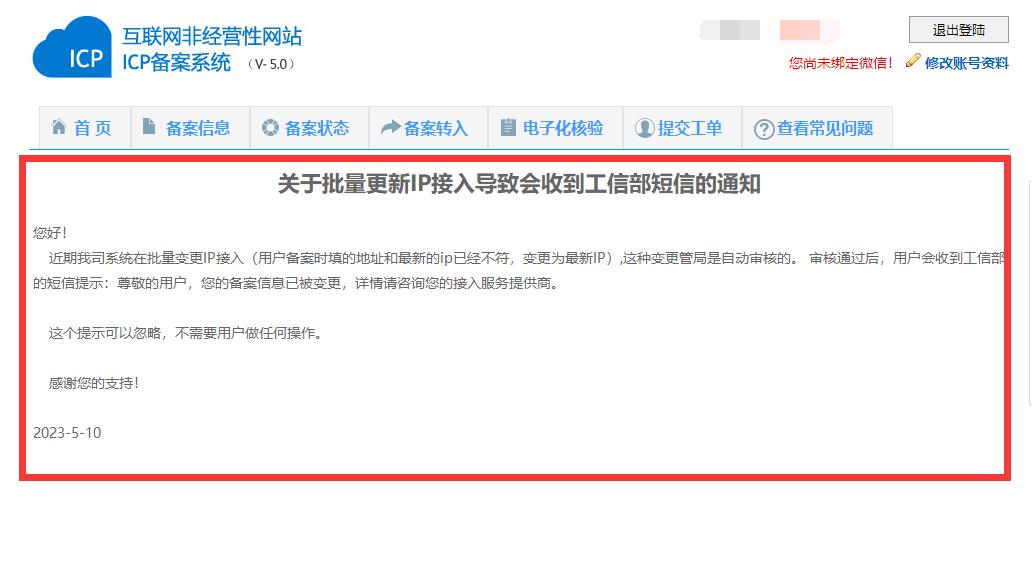 近期我司系統(tǒng)在批量變更IP接入(用戶備案時填的地址和新的ip已經(jīng)不符,變更為新IP),這種變更管局是自動審核的。 審核通過后,用戶會收到工信部的短信提示:尊敬的用戶,您的備案信息已被變更,詳情請咨詢您的接入服務提供商。